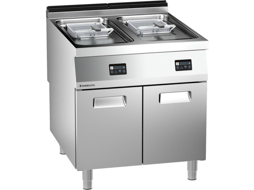 Professionele elektrische friteuse met twee kuipen van elk 15 liter, volledig uitgevoerd in hoogwaardig AISI 304 roestvrijstaal met een 2 mm dik werkblad. De geperste kuipen zijn naadloos in het werkblad geïntegreerd, voorzien van afgeronde hoeken en een ruime afvoerzone. Elke kuip wordt geleverd met een frituurmand en een passend deksel.