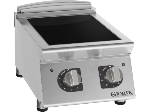 De Giorik CI720T is een compacte inductiekookplaat met twee kookzones, speciaal ontworpen voor professioneel gebruik waar snelheid, veiligheid en efficiëntie centraal staan. De buitenzijde is uitgevoerd in roestvast staal en het werkblad is vervaardigd uit AISI 304 met een dikte van 1,2 mm, wat zorgt voor een robuuste en hygiënische afwerking. Het 6 mm dikke keramische kookoppervlak is eenvoudig te reinigen en voorzien van twee onafhankelijke kookzones van elk 3,5 kW met een diameter van 230 mm.