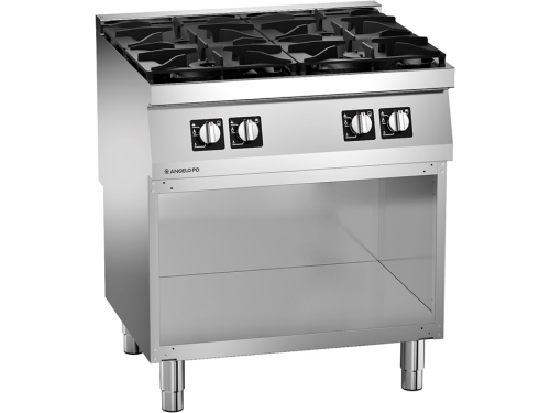 Onder het kookoppervlak bevindt zich een open onderkast, ideaal voor het opbergen van potten, pannen of GN-bakken. Met zijn robuuste constructie, hoge vermogen en praktische indeling is de Angelo Po 4-pits op onderkast een betrouwbare keuze voor elke professionele keuken die topprestaties verlangt in een compact en functioneel ontwerp.