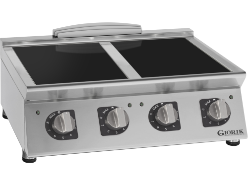 De Giorik CI740T is een krachtige inductiekookplaat met vier kookzones, ideaal voor professionele keukens die hoge prestaties combineren met energie-efficiëntie. De buitenzijde is volledig uitgevoerd in roestvast staal, terwijl het werkblad is vervaardigd uit AISI 304 met een dikte van 1,2 mm voor maximale duurzaamheid en hygiëne. Het 6 mm dikke keramische kookoppervlak is eenvoudig te reinigen en beschikt over vier onafhankelijke kookzones van elk 3,5 kW en een diameter van 230 mm.