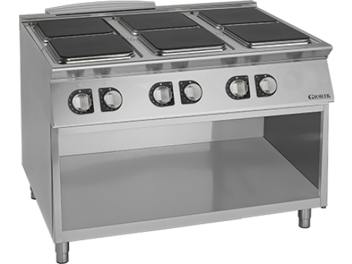 De Giorik CE76QG is een robuuste en krachtige elektrische kooktafel die speciaal is ontworpen voor professionele keukens met hoge capaciteitseisen. Uitgerust met zes duurzame gietijzeren kookplaten (3x 2,6 kW en 3x 4,2 kW) levert dit toestel een indrukwekkende combinatie van snelheid, vermogen en nauwkeurige controle. De open onderkast biedt praktische opbergruimte, zodat keukenbenodigdheden altijd binnen handbereik zijn en de werkruimte optimaal wordt benut.