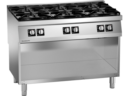 Onder het kookgedeelte bevindt zich een ruime open onderkast, ideaal voor het opbergen van pannen, GN-bakken of andere keukenbenodigdheden, zodat alles binnen handbereik is tijdens het koken. Dankzij zijn krachtige prestaties, solide constructie en praktische indeling is de Angelo Po 6-pits op onderkast een onmisbare krachtpatser voor iedere professionele keuken die op topniveau wil presteren.
