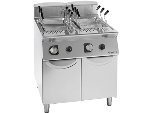 De Giorik CPG746 is een krachtige dubbele gasgestookte pastakoker, ideaal voor horecakeukens waar snelheid, capaciteit en betrouwbaarheid essentieel zijn. Met twee afzonderlijke tanks van elk 26 liter kan deze machine gelijktijdig verschillende soorten pasta bereiden of grote hoeveelheden in korte tijd verwerken. De robuuste buitenpanelen zijn vervaardigd uit roestvast staal, terwijl het werkblad is uitgevoerd in AISI 304 met een dikte van 1,5 mm, wat garant staat voor duurzaamheid en eenvoudig onderhoud.