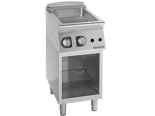 De Giorik BM720E is een elektrische bain-marie op een open onderstel, ontworpen voor professioneel gebruik in horecakeukens waar het warmhouden van gerechten op constante temperatuur essentieel is. Met een breedte van 400 mm, een diepte van 700 mm en een hoogte van 900 mm past dit model naadloos in de Unika 700-lijn en combineert het compacte afmetingen met hoogwaardige prestaties. De buitenzijde is volledig uitgevoerd in roestvast staal, terwijl het werkblad van AISI 304 met een dikte van 1,2 mm zorgt voor een duurzame en hygiënische werkruimte zonder schoorsteenuitsparing.