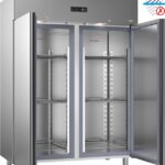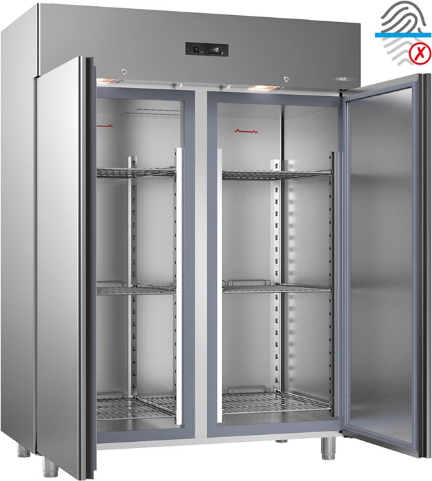 Koelkast met een interne en externe structuur uit één stuk van speciaal vingerafdrukbestendig staal. Opslagkamer uitgerust met schapdragers van AISI 304 roestvrij staal, 21 niveaus. Geventileerd koelsysteem, verdamper geplaatst buiten de koelkamer. Bedieningspaneel met digitale thermometer-thermostaat. Elektrische ontdooiing. Standaard geleverd met: 6 geplastificeerde GN 2/1 roosters, 6 paar AISI 304 roestvrijstalen geleiders en 3 geplastificeerde verbindingsroosters.