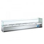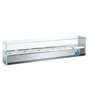 U kunt in de gekoelde opzet saladiere 8 1/3 gastronorm bakken plaatsen waarin u diverse salades of ingrediënten op de juiste temperatuur kunt bewaren.