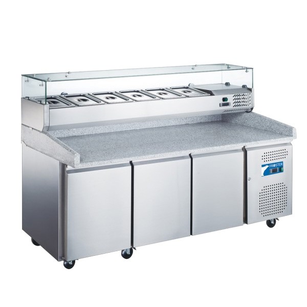 Gekoelde pizzawerkbank van hoge kwaliteit met graniet werkruimte. De pizza werkbank heeft een inhoud van maar liefst 580 liter!