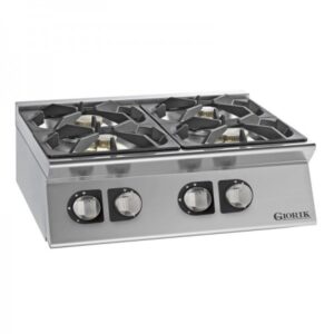 Kwalitatief hoogstaande kooktafel uit de Unika700 Top serie van het Italiaanse merk Giorik. Deze krachtige opzetmodel 6-pits kooktafel met een totaal vermogen van maar liefst 36 kW, is volledig vervaardigd uit het RVS. De 6-pits kooktafel is uitgerust met zwarte geëmailleerde gietijzeren roosters die geschikt zijn voor pannen met een kleine diameter.