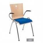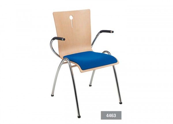 Een representatieve, stapelbare stoel met armleuningen die in verschillende uitvoeringen geproduceerd kan worden. De uitsparing in de rug geeft de stoel een verfijnde finishing Touch. De stoel 4463 is uitgevoerd met een blank houten kuip, gestoffeerde zitting en verchroomd frame.