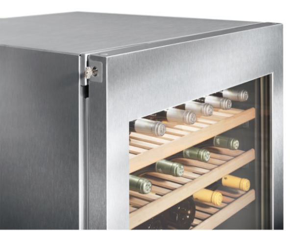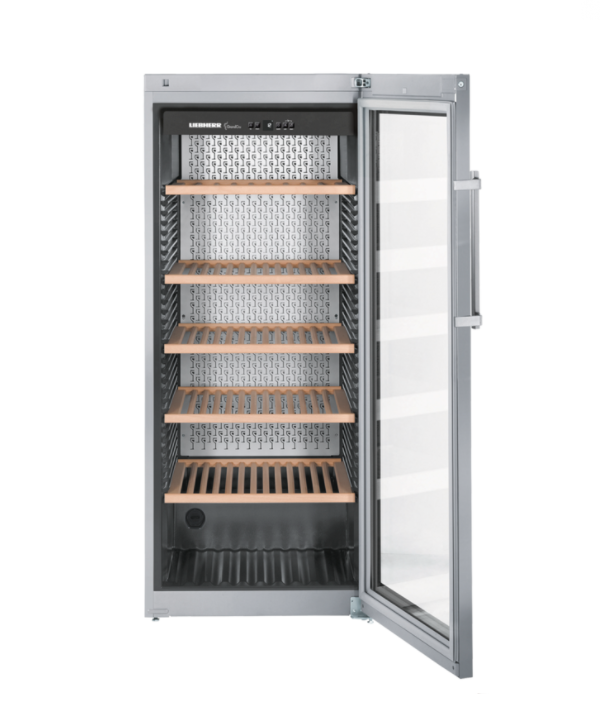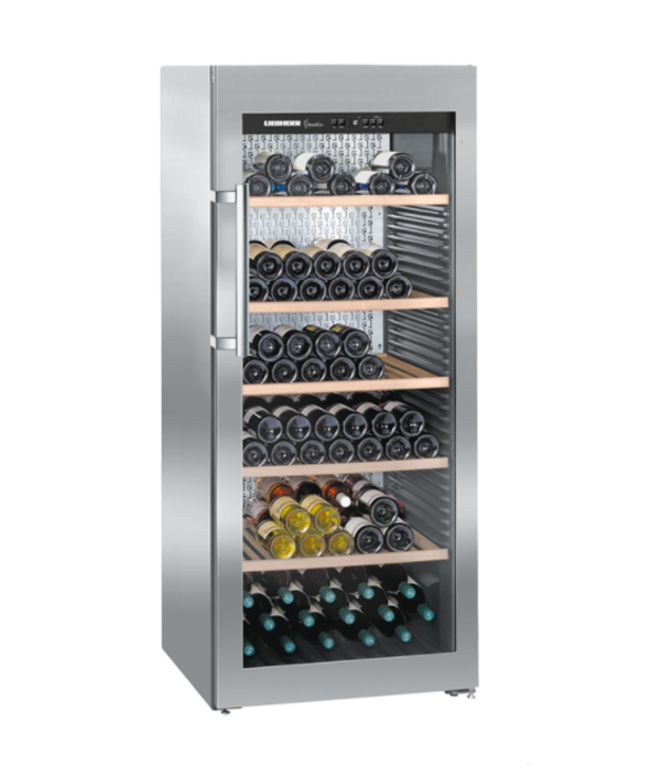 De Liebherr wijnbewaarkast WKes 4552 met UV gecoate isolatieglasdeur is rondom uitgevoerd in edelstaal. GrandCru model met verstelbare houten legplateaus, digitale temperatuurmeter, dimbare LED verlichting, temperatuur- en deuralarm. Capaciteit 201 flessen (Bordeauxformaat).