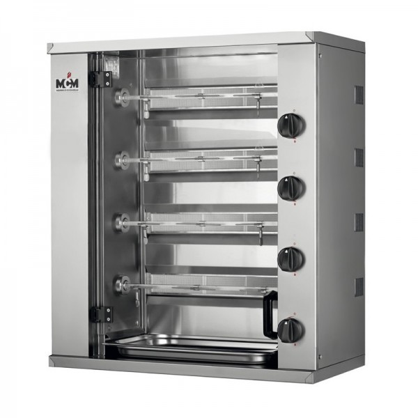 De MCM gas kippengrill MN4G heeft een vermogen van 13.760 Kcal/h en is uitgerust met 4 spitten, met op elke spit ruimte voor 3 kippen.