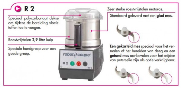 De Robot Coupe R2 is een tafelmodel cutter. Een cutter is uitermate geschikt voor het vervaardigen van farces, hakken, emulsies, mousses, en knedingen met een perfect eindproduct en dit in enkele minuten. Voor het vervaardigen van mousses en farces is het aangeraden te werken met een snelheid van 3000 tpm.