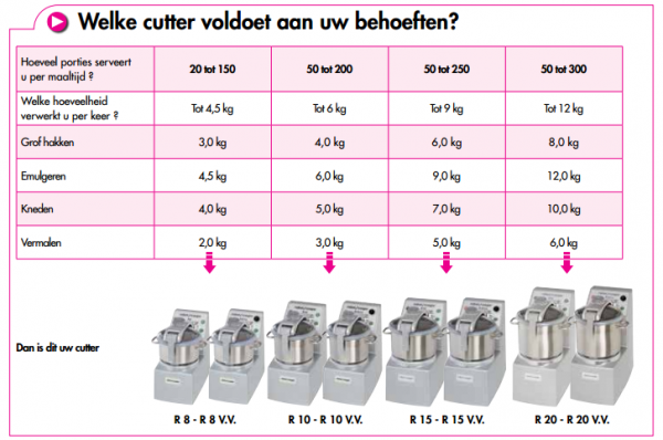 De Robot Coupe R20 is een cutter. Een cutter is uitermate geschikt voor het vervaardigen van farces, hakken, emulsies, mousses, en knedingen met een perfect eindproduct en dit in enkele minuten. Voor het vervaardigen van mousses en farces is het aangeraden te werken met een snelheid van 3000 tpm.