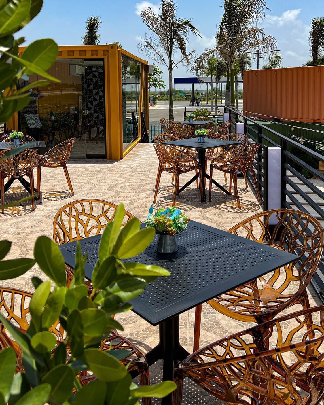 De terrasstoel Crystal is leverbaar in de kleuren zwart, rood en amber.