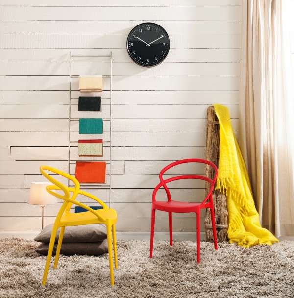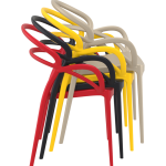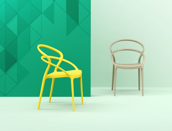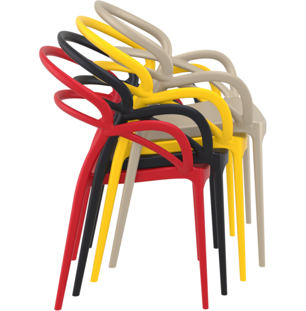 De design stoel Mila met armleuningen wordt geproduceerd met een enkele injectie van polypropyleen versterkt met glasvezel, verkregen door middel van de nieuwste generatie luchtvormtechnologie. Geschikt voor binnen en buiten gebruik.